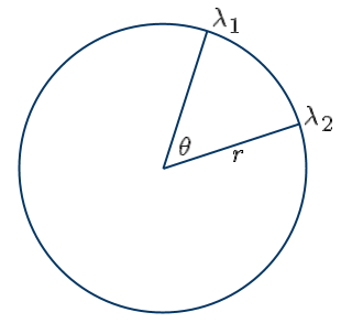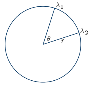 The circumference of a circle, C, is 2πr, where r is the radius of the circle. The length of the arc from angle λ2 to λ1, our d, can be found using the fact a sector of a circle is a fraction of the circumference. What fraction? If we are measuring the angles in radians, then the sector is θ/2π of the whole circle. All there is to do is multiply.