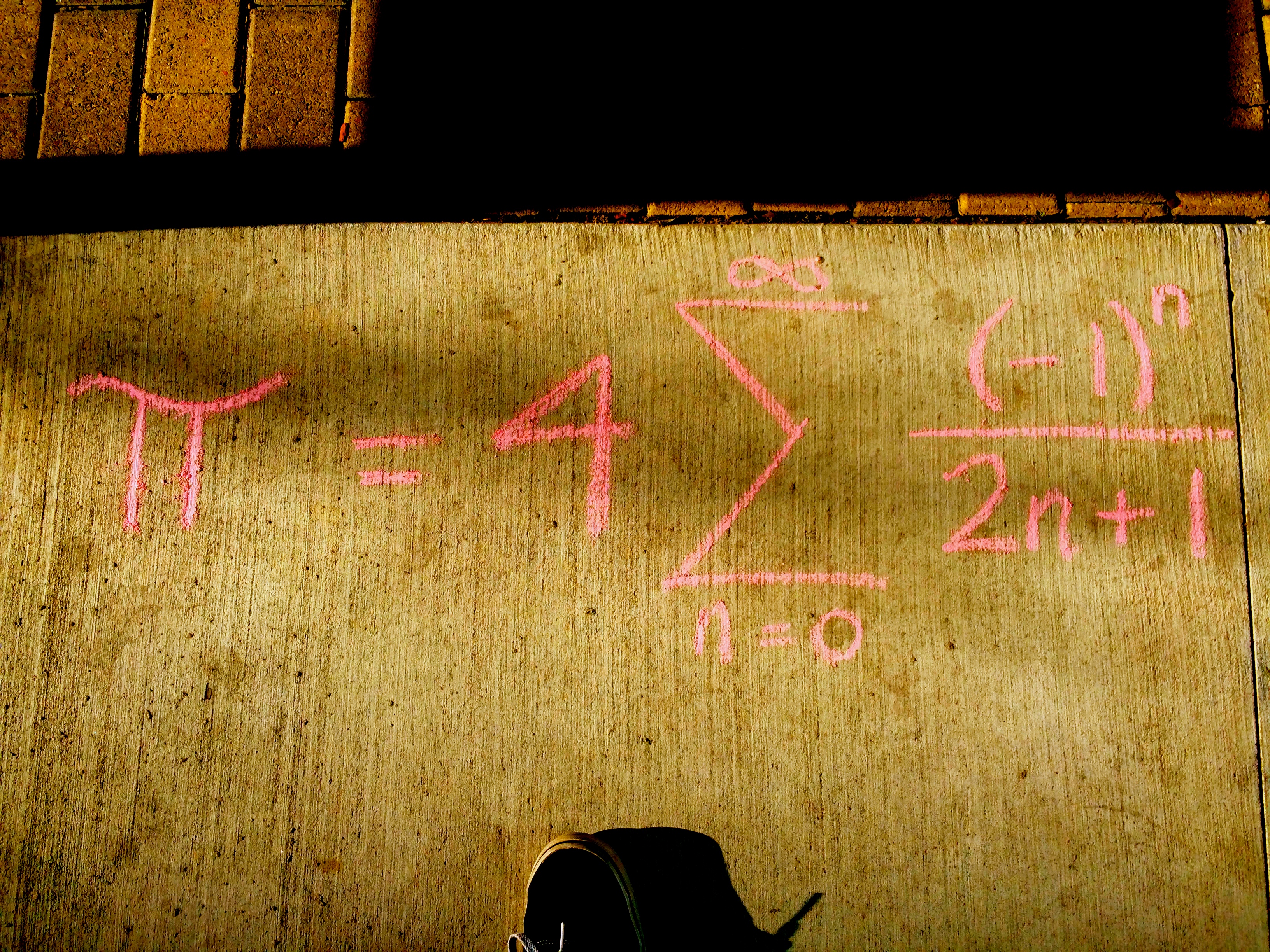 Pi Day this year has been made a bigger deal than usual. Drop the 20, go with US date conventions, and we are sitting on 3/14/15: the first digits of π ≈ 3.1415. At 9:26:53 this morning, we had even more digits. Wolfram threw a party in Austin during SXSW. At the time, I was a few blocks away chatting with a gentleman from Scotland over some fresh chalk about an infinite series for π.
