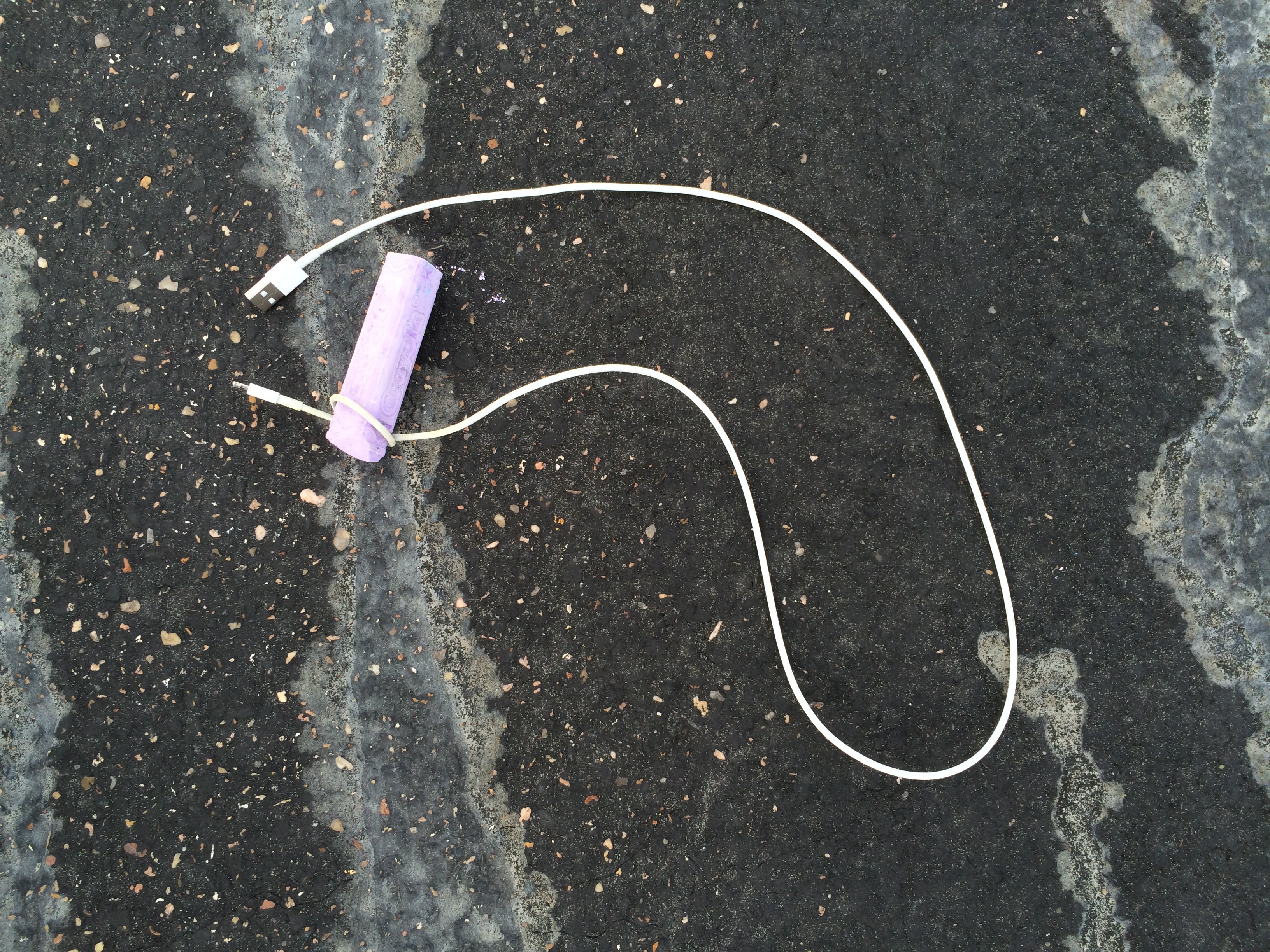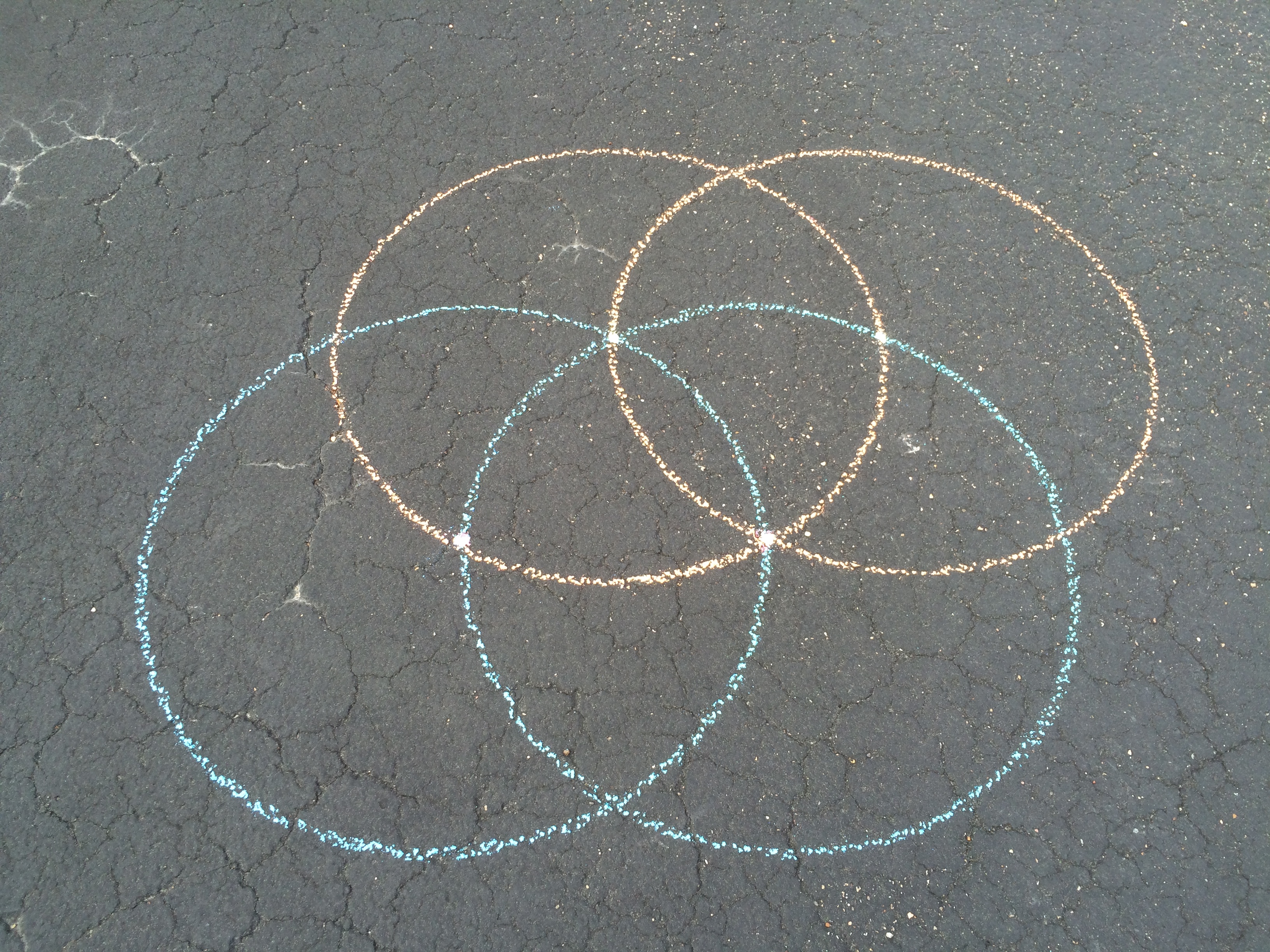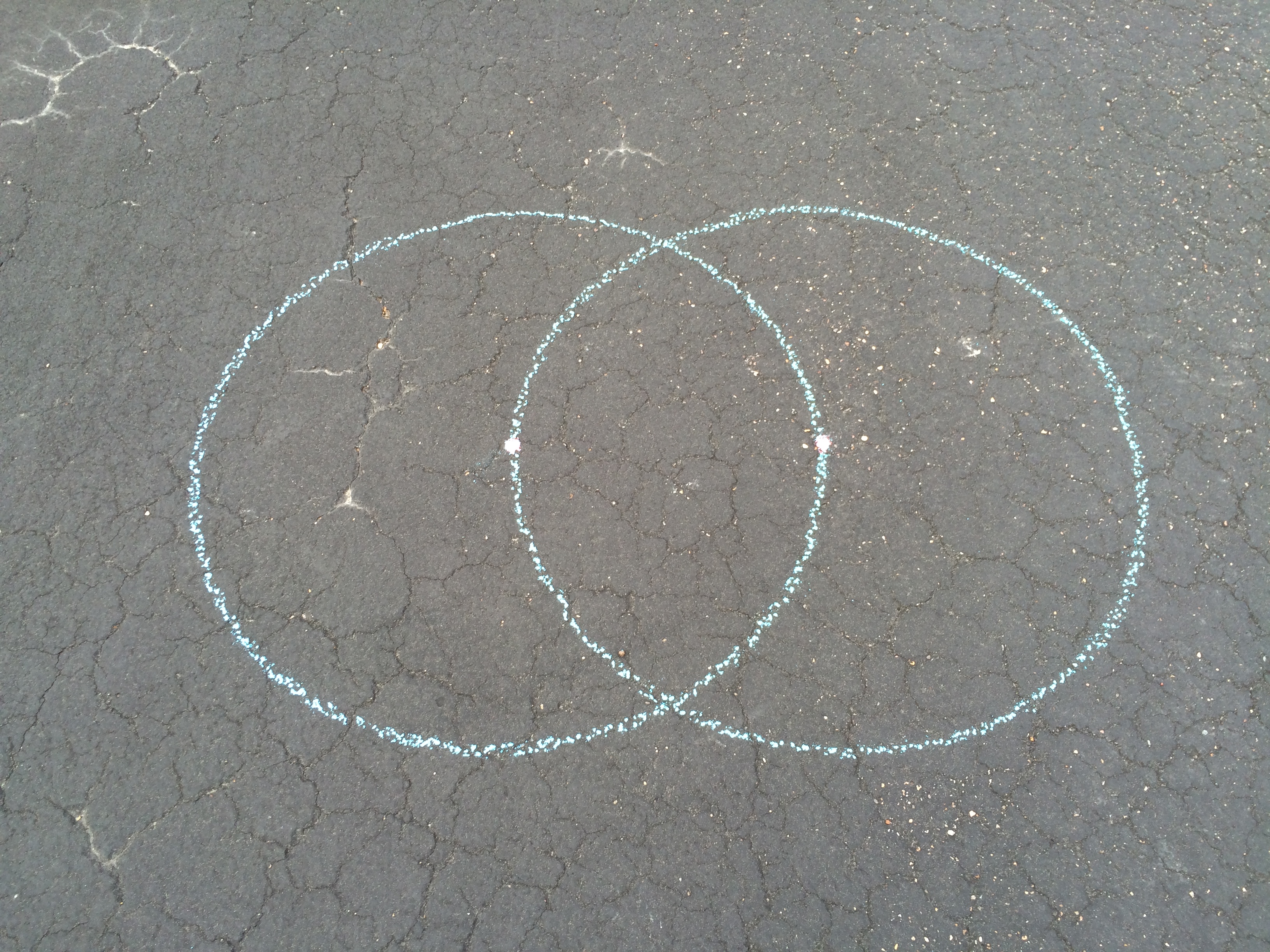 The Mascheroni construction featured here locates the midpoint between two given points. String, USB cable (my hunk of string was too short), and chalk turn out not to be high precision instruments. Maybe I just needed more practice with my tools. I missed the midpoint due to accumulating error. I did a better job with paper, pencil, and compass.